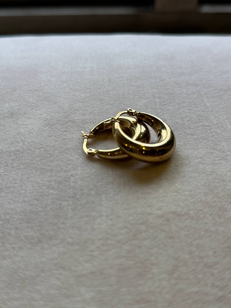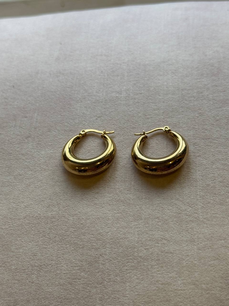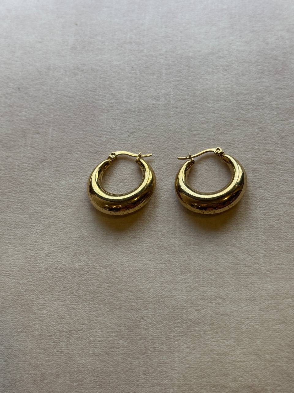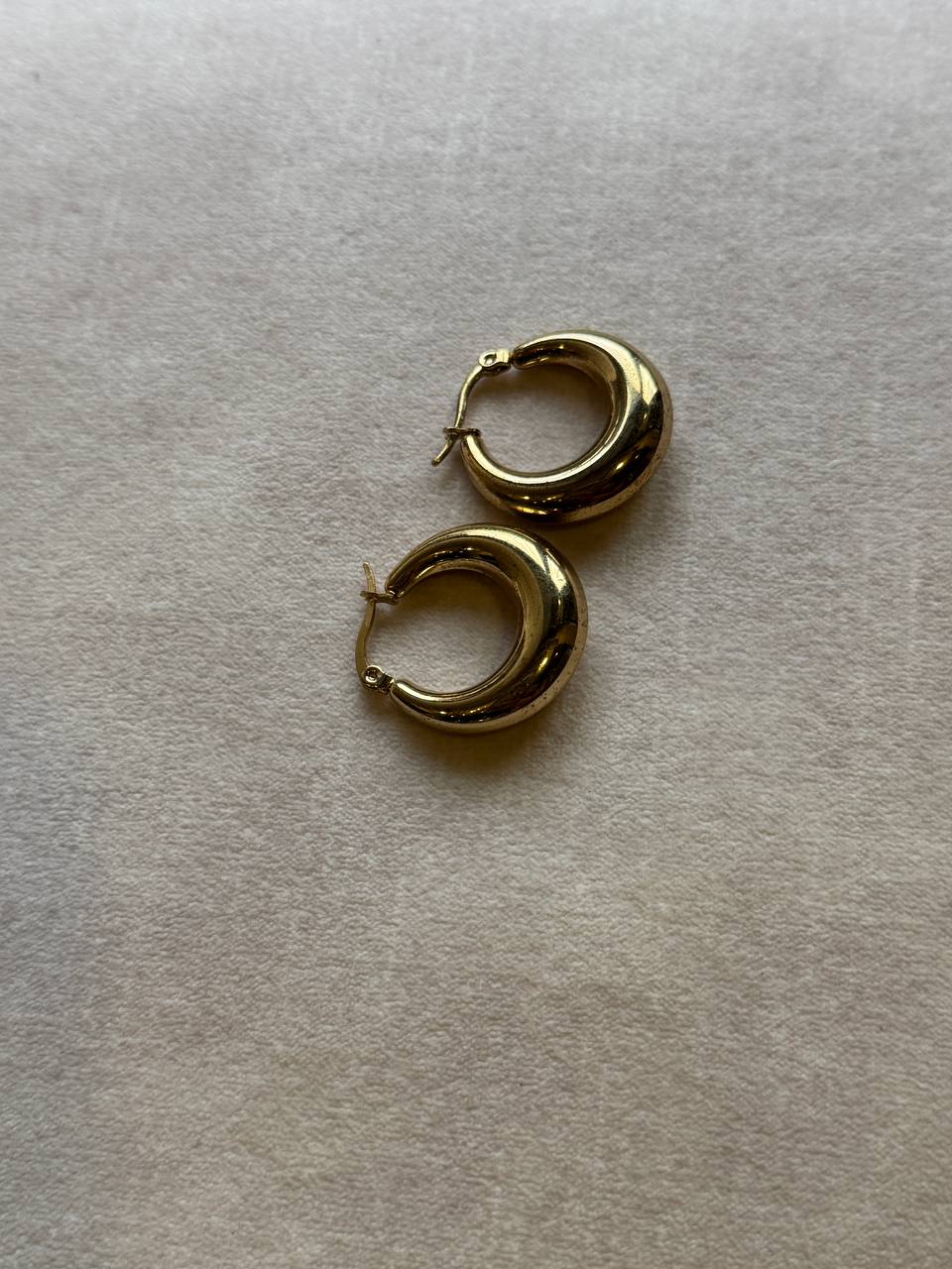 Solara is a pair of gold chunky hoop earrings with a smooth, polished finish, exuding a bold yet elegant charm.