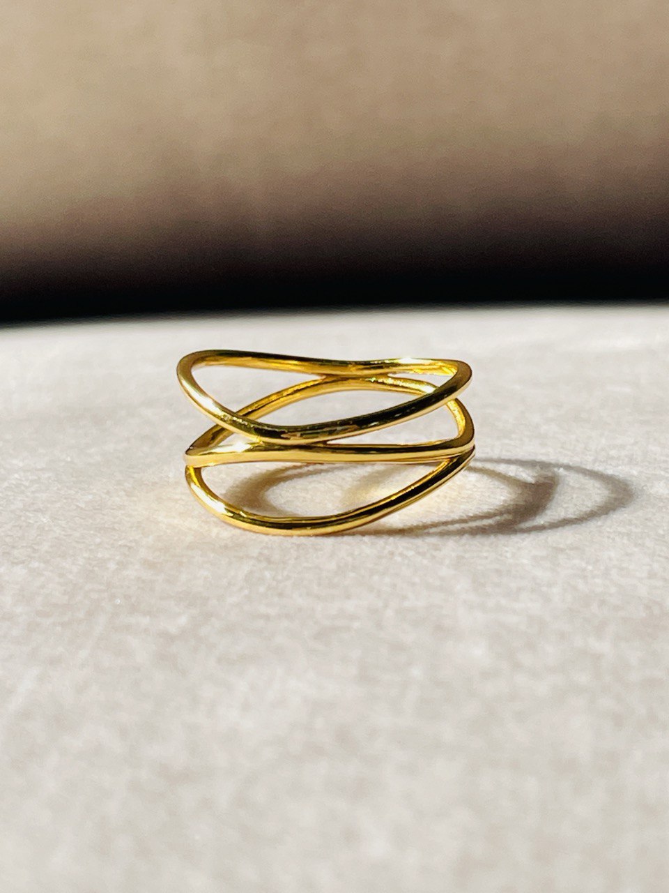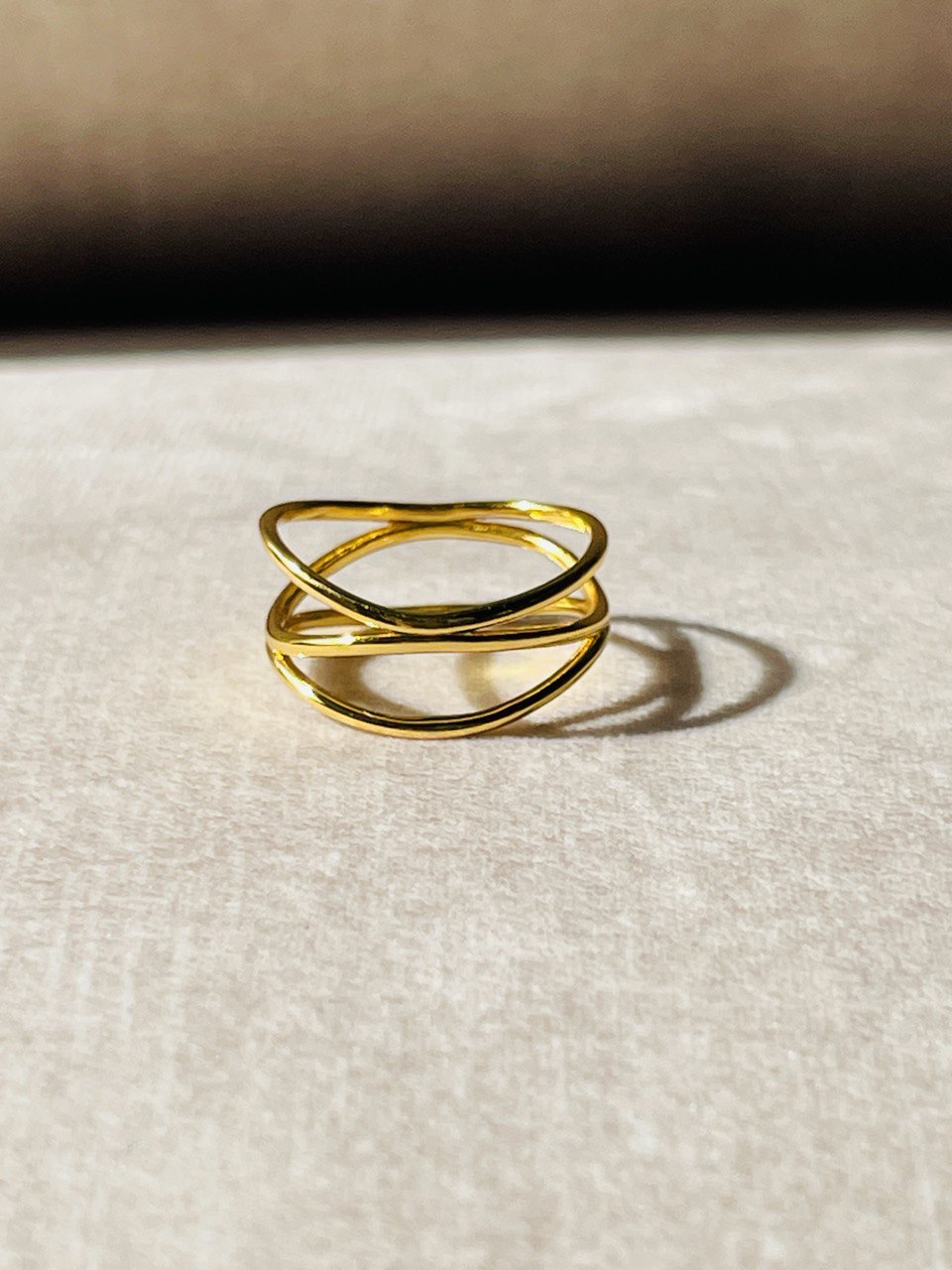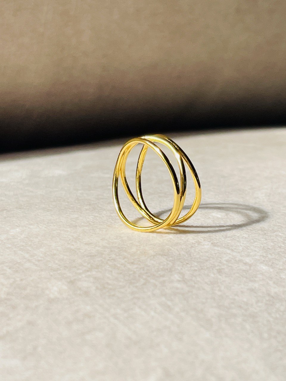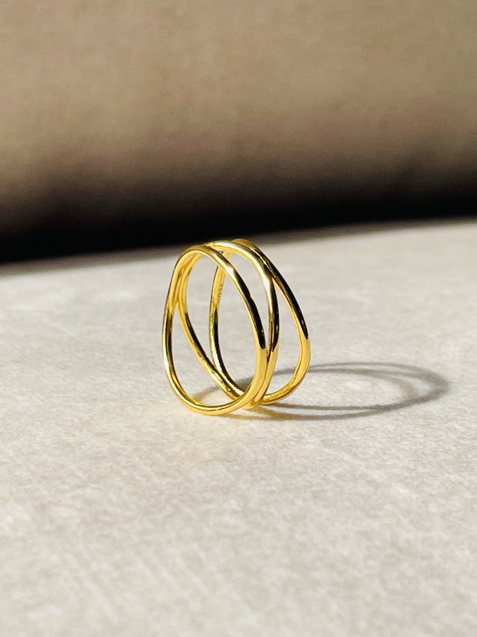 Modern gold-plated ring made from 925 sterling silver. The design consists of two gracefully interwoven, thin bands that create an airy, geometric form. Its minimalist aesthetic and polished finish give it a sophisticated, contemporary look ideal for everyday elegance or as a delicate statement piece. The ring is placed on a soft, neutral-toned surface, with natural light highlighting its rich golden hue and creating a subtle, artistic shadow.